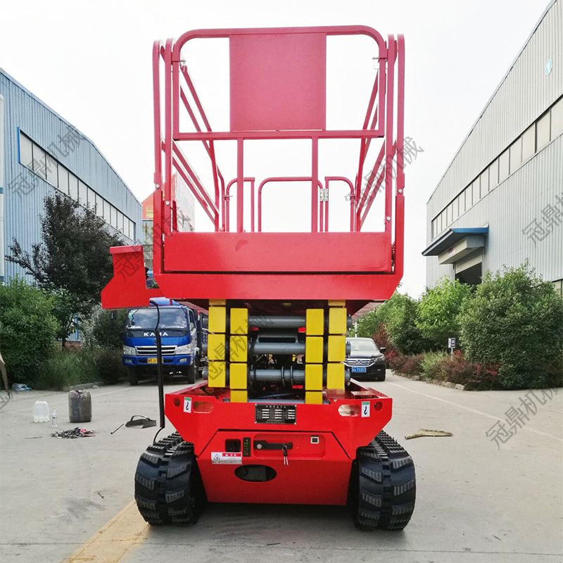 履帶式液壓升降平臺采用加重底盤,工作時,不需要支腿,在升降機升起后,不需要不把升降機收起即可行走,極大的提高了工作效率,同時,它的履帶式車輪,增加了與大地接觸的面積,在野外泥濘道路上也可行走和工作,是石油勘探、野站部隊通信線路安裝施工等野外高空作業的理想設備。